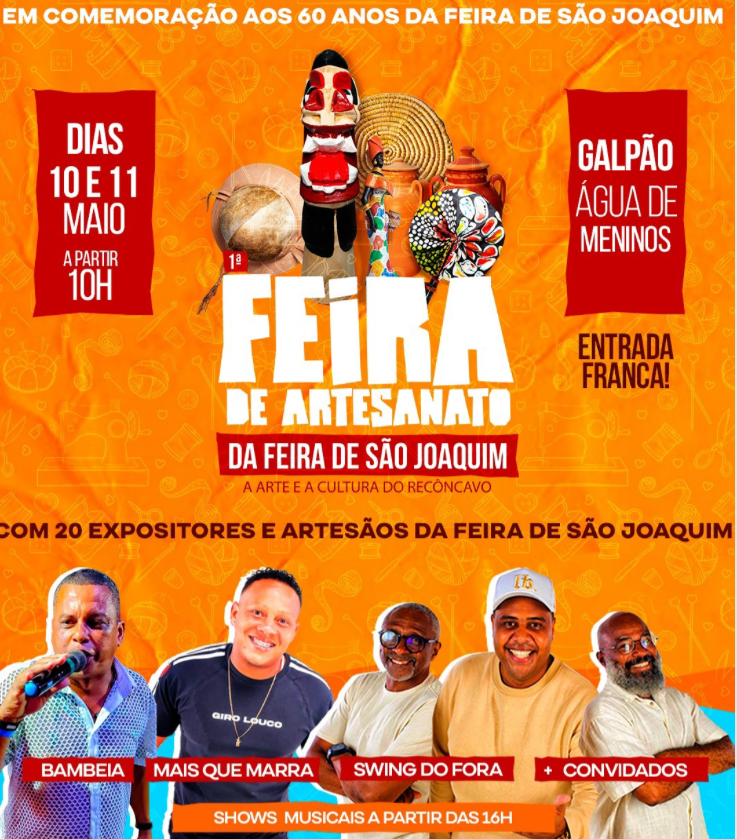 A Feira de Artesanato da Feira de São Joaquim acontece entre 10 e 11 de maio, a partir das 10 horas, no Galpão de Água de Meninos, localizado na Feira de São Joaquim, no bairro da Calçada. No local, é possível encontrar peças variadas de artesanato de 20 expositores e artesãos da Feira de São Joaquim e do recôncavo. A entrada é gratuita.