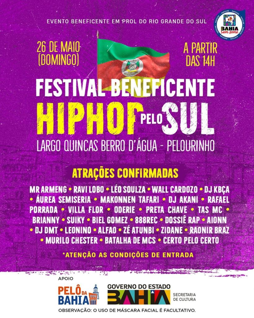 No dia 26 de Maio (domingo), o Largo Quincas Berro D’Água (Pelourinho), será palco do Festival Beneficente Hip Hop pelo Sul. O evento, que visa agregar os 5 elementos da cultura Hip Hop (MC, DJ, Breaking, Grafite e Conhecimento), tem por objetivo a arrecadação de doações para o estado do Rio Grande do Sul (que sofre nesse momento com as enchentes e a crise climática).