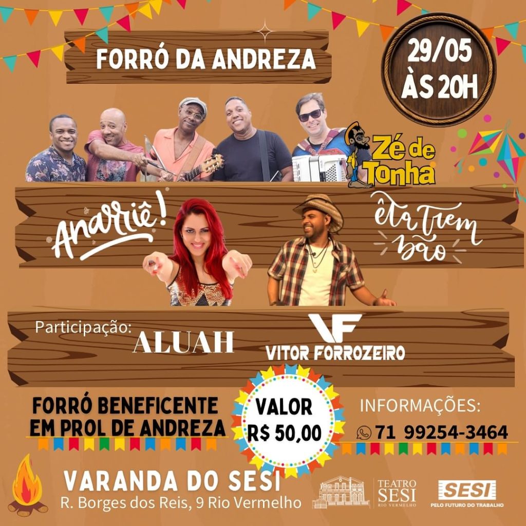 O Forró da Andreza é um evento beneficente para ajudar Andreza a conseguir uma prótese craniana. Ele ocorrerá na quarta (29/05), às 20h, e terá participação de Zé de Tonha, Anarriê, Êta Trem Bom, Aluah e Vitor Forrozeiro.