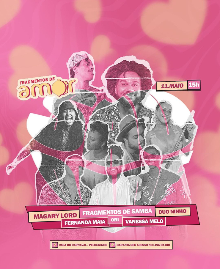 Neste sábado, 11 de maio, acontece a Fragmentos de Amor roda de samba mais romântica da Fragmentos do Samba, com participações de Magary Lord, Ori, Fernanda Melo e Vanessa Melo. A noite tem ainda show de abertura do Duo Ninho, feira de arte e discotecagem do Dj Kjester.