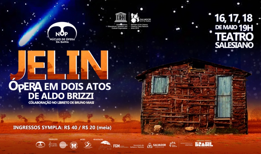O Núcleo de Ópera da Bahia (NOP) apresenta Jelin – ópera em dois atos de Aldo Brizzi. Essa será a estreia da nova produção em língua portuguesa que acontecerá no Teatro Salesiano em Nazaré. Serão 3 récitas, nos dias 16, 17 e 18 de maio sempre às 19h. O espetáculo tem 2 horas de duração.