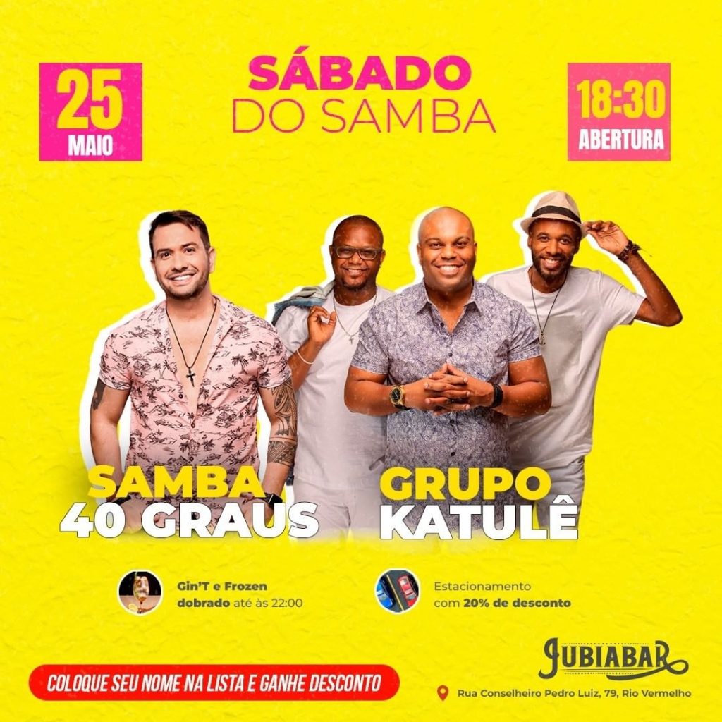 Neste sábado (25/05) ocorre o Sábado do Samba com Grupo Katulê e Samba 40 graus. O evento acontecerá às 18:30h no Jubiabar, localizado na Rua Conselheiro Pedro Luiz, 79, Rio Vermelho.