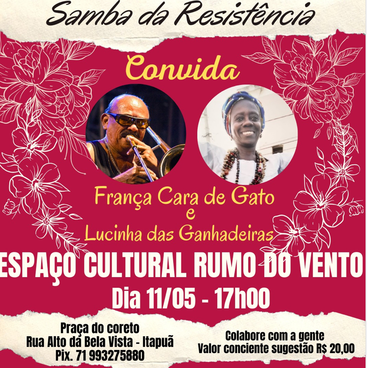 O Samba da Resistência do mês de maio traz atrações muito especiais no Espaço Cultural Rumo do Vento, no próximo dia 11 de maio, sábado, a partir das 17hs. Lucinha das Ganhadeiras de Itapuã, cantora que encanta as apresentações das Ganhadeiras de Itapuã com sua voz ancestral, e do excelente trombonista, compositor e arranjador França Cara de Gato que já atuou no Rio de Janeiro ao lado de nomes como Alcione, Emílio Santiago e Roberto Carlos e na Bahia com as bandas Araketu, Chiclete com Banana, Luiz Caldas, Edson Gomes entre outros. Eles serão nossos convidados de honra e darão um molho especial ao Samba da Resistência, sempre muito democrático e acolhedor na comunidade de Itapuã. O evento é gratuito, mas é pedido a colaboração consciente para a manutenção do projeto. Valor sugerido 20 reais.