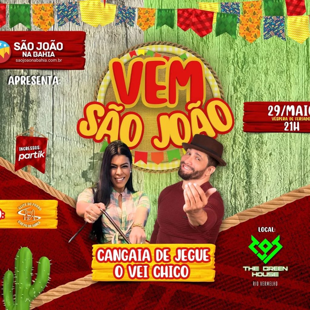 Vem São João é uma festa de mais de 4h forró, com participação das bandas O Vei Chico e Cangaia de Jegue. Ainda terá DJ Ian Vitor e um aulão com Grupo ELITE DE FORRÓ. O evento acontecerá às 21h na quarta (29/05)