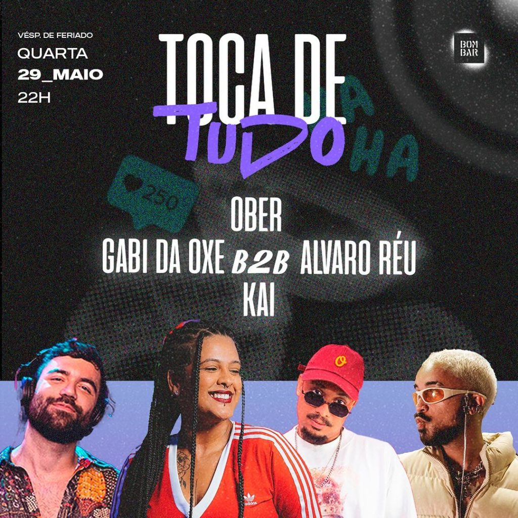 Nesta quarta (29/05), às 22h, vai acontecer o evento Toca de Tudo no Bombar, localizado na Rua canavieiras, 24, Rio Vermelho. Dj Kai, Gabi da B2B, Alvaro Reu e Ober farão os DJs Sets, que vão durar até 05h da manhã.