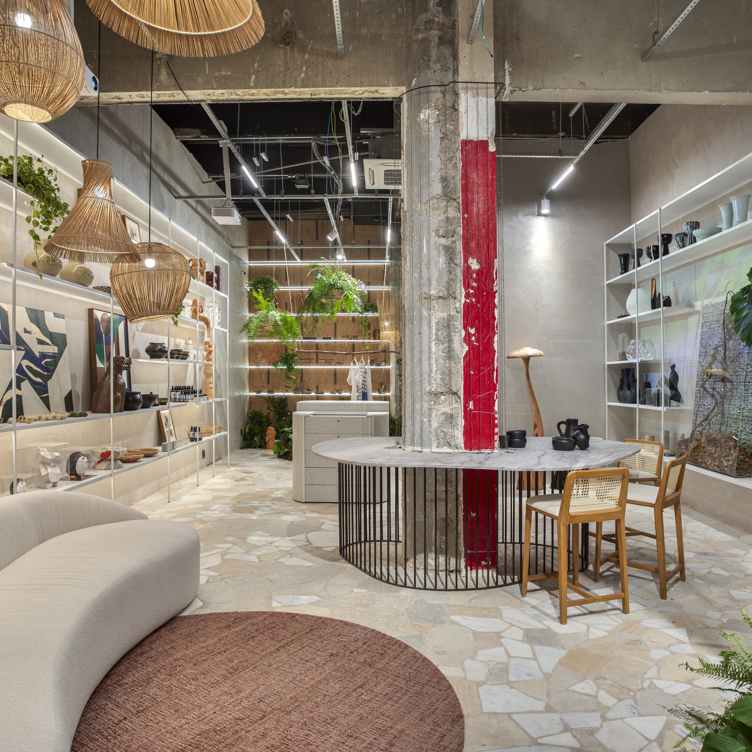 Unir o encanto do artesanal com a contemporaneidade é a proposta dos arquitetos Lucas Blaia e Bruno Moura para a loja da Feira na Rosenbaum. Respeitando a arquitetura modernista do Conjunto Nacional, o espaço de 55 m² se fundamenta em obras artísticas de crochê confeccionadas com linhas que seriam descartadas, além de uma instalação maior feita de palha. Já a paleta de cores em tons de terracota, sugestionada pelo bioma Amazônia, é complementada pela madeira e pelo piso composto de sobras de cacos de mármore.