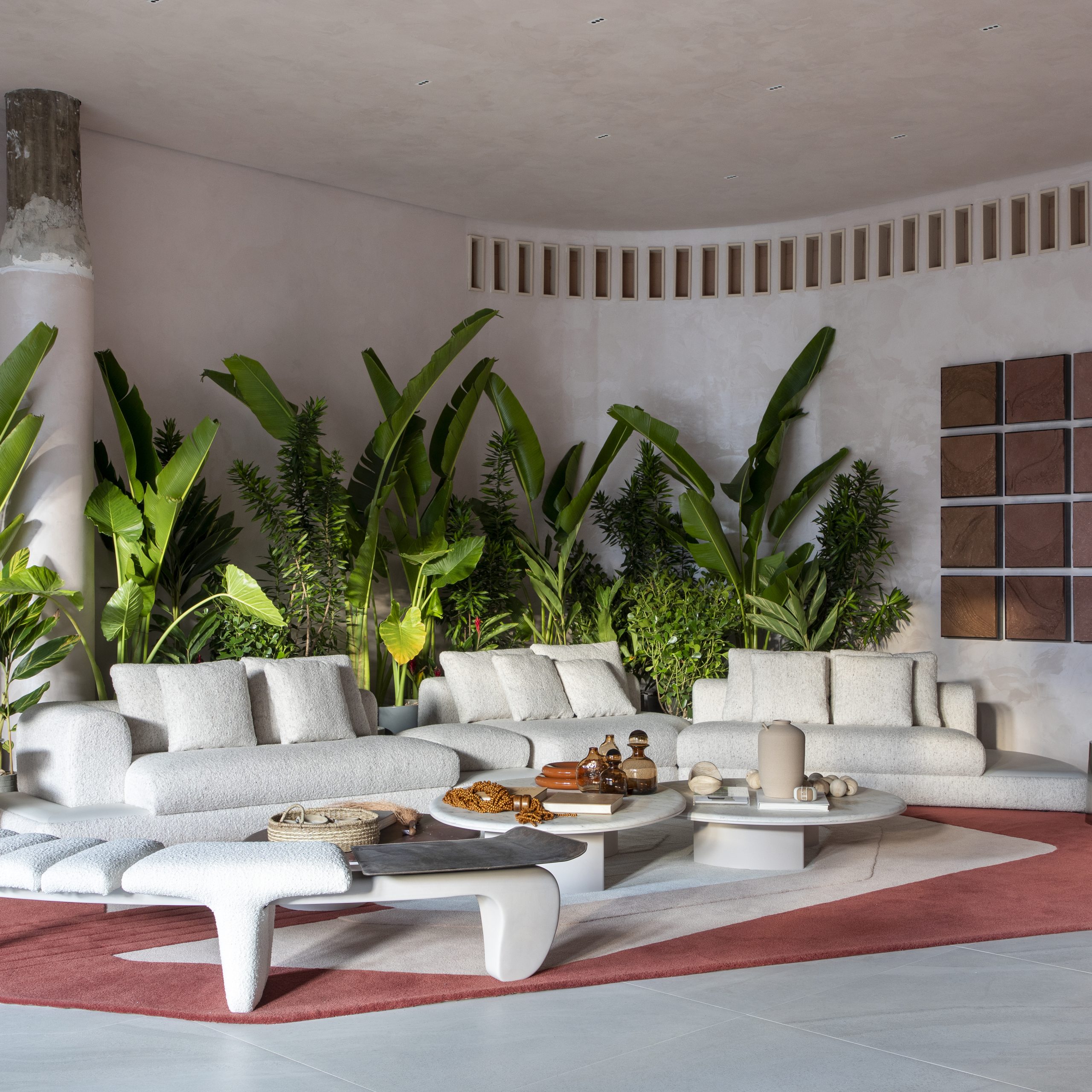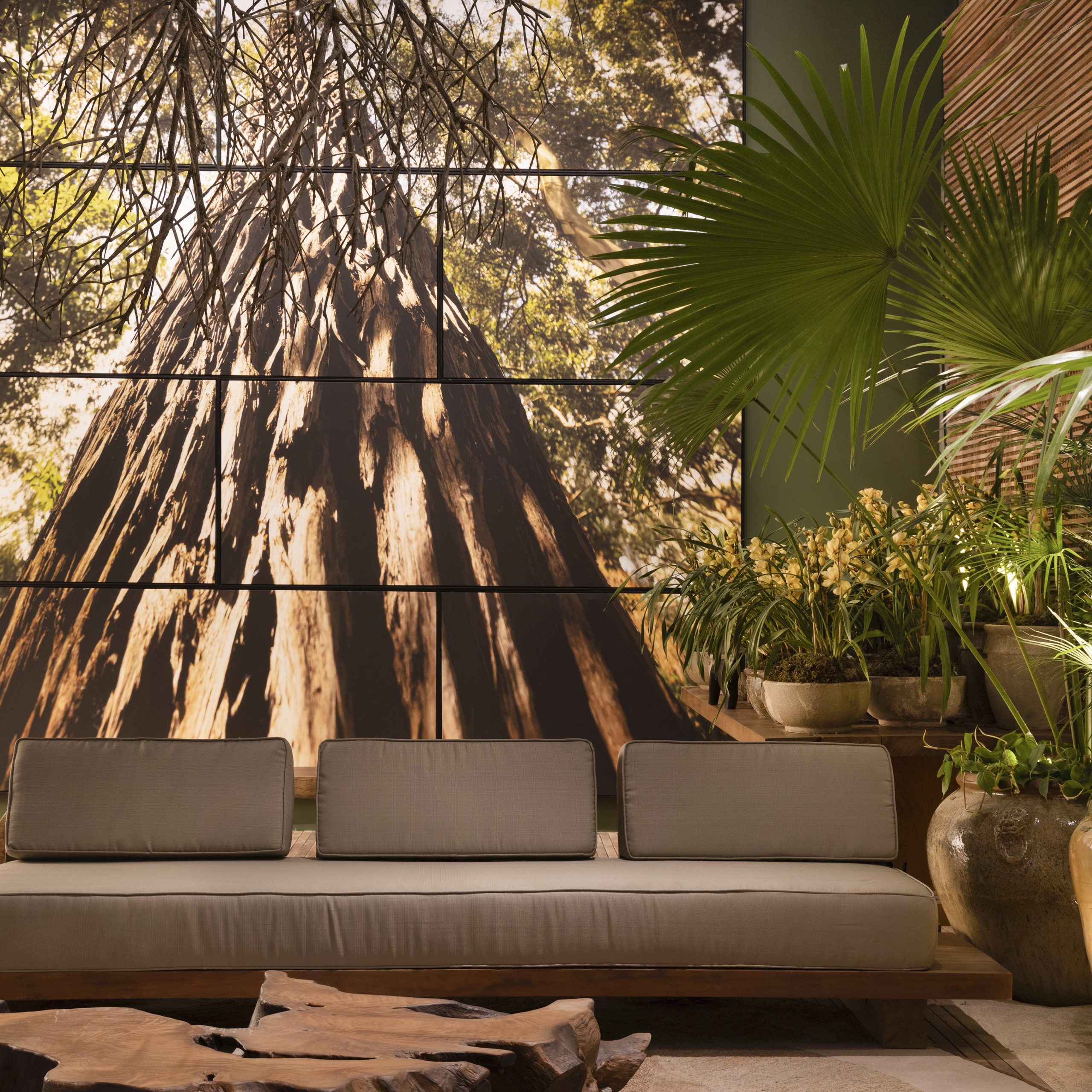 Em 109 m², madeira de reflorestamento, vasos e lustres de barro, além de tapetes de sisal e de couro reciclado, compõem um ambiente aconchegante. O uso de materiais naturais na vida cotidiana remonta aos primórdios da civilização: terra, fibras, pedra e madeira. A partir desses elementos tradicionais e da interconexão entre pessoas e natureza, a Trees Arquitetura projetou esta casa, que funcionará, durante o evento, como o escritório da plataforma de entretenimento Aviva.