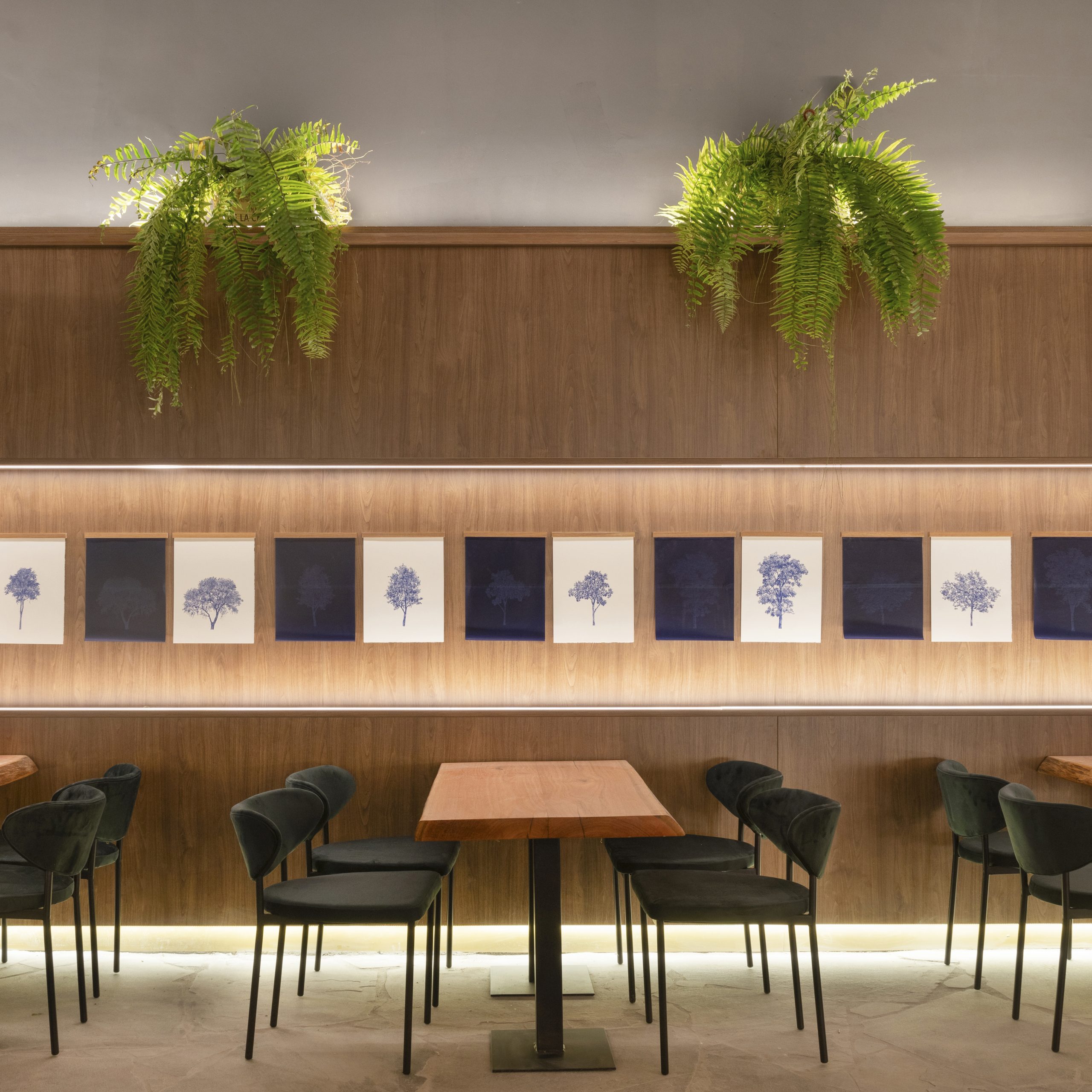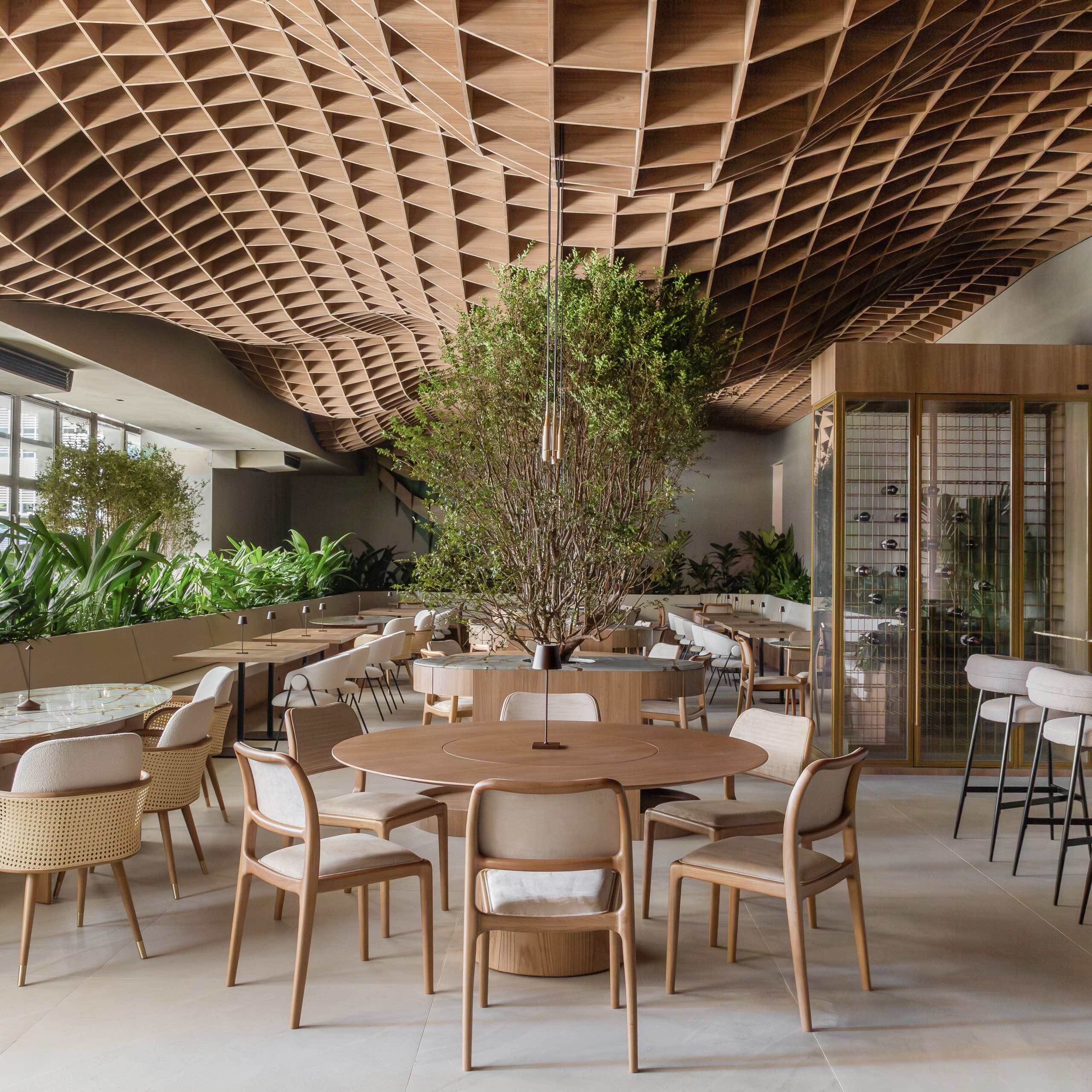 Impossível entrar no salão do Ristorantino e não olhar para cima: projetado com técnicas paramétricas e inteligência artificial, o imponente forro de MDF que sobrevoa os 339 m² como uma nuvem gigantesca é o que captura a atenção – provavelmente seguido das bancadas e tampos de quartzito blue deep. O clima futurista com toques de maximalismo idealizado pelo escritório Guardini Stancati é regado a abundante luz natural e princípios biofílicos.