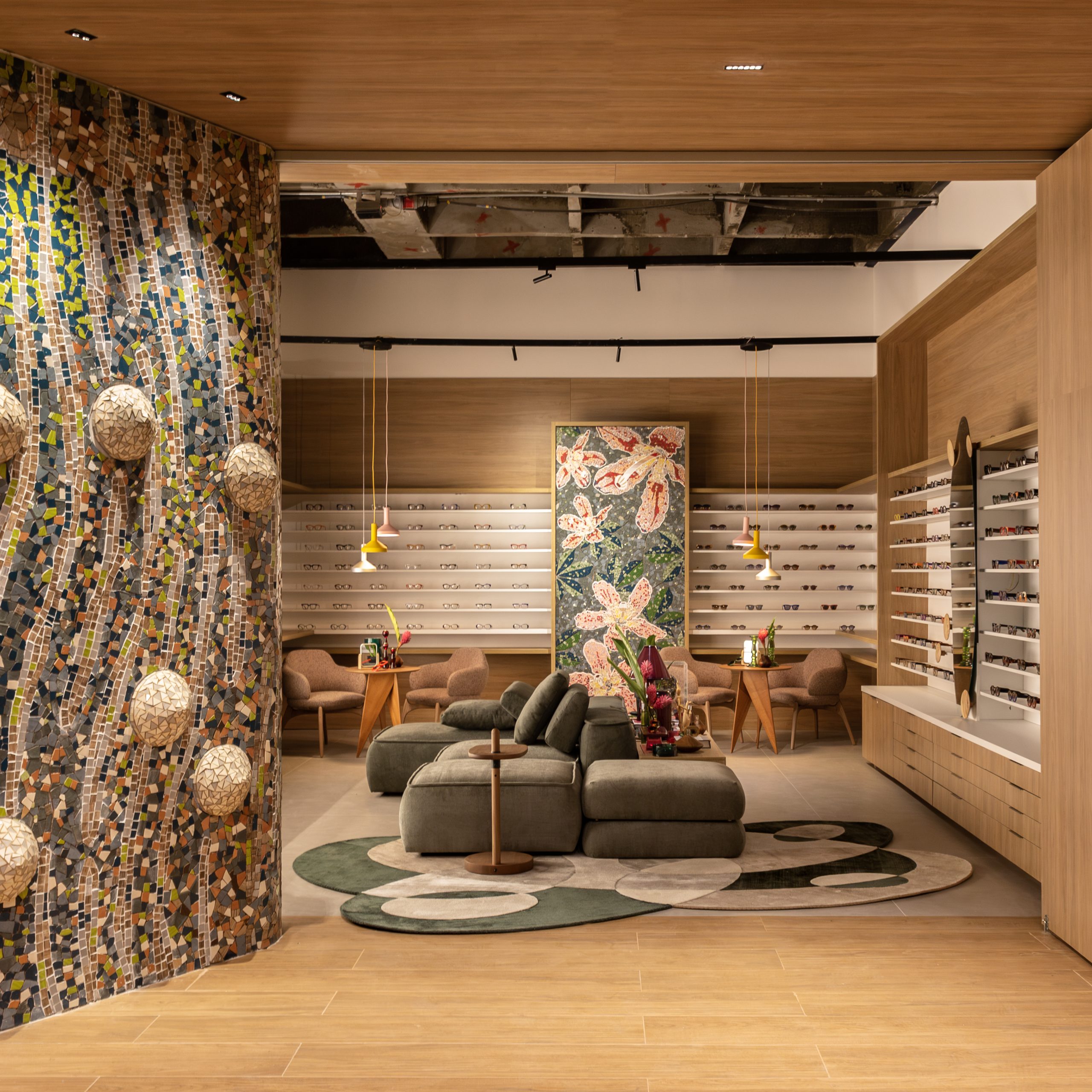 A diversidade cultural e natural da Bolívia irrompe na ótica de 54 m² montada por Eduardo Baldelomar para a Gustavo Eyewear, que toma uma árvore emblemática de sua flora como ponto de partida. A paleta veste as cores da ceiba camba, espécie de paineira, e tinge de rosa e amarelo o mobiliário. O mosaico, executado em cerâmica pelo artista Andrés Fenix, conterrâneo do arquiteto, aparece em dois painéis. Ao fim do evento, eles serão doados para uma ONG que trabalha pela preservação da biodiversidade do país andino.
