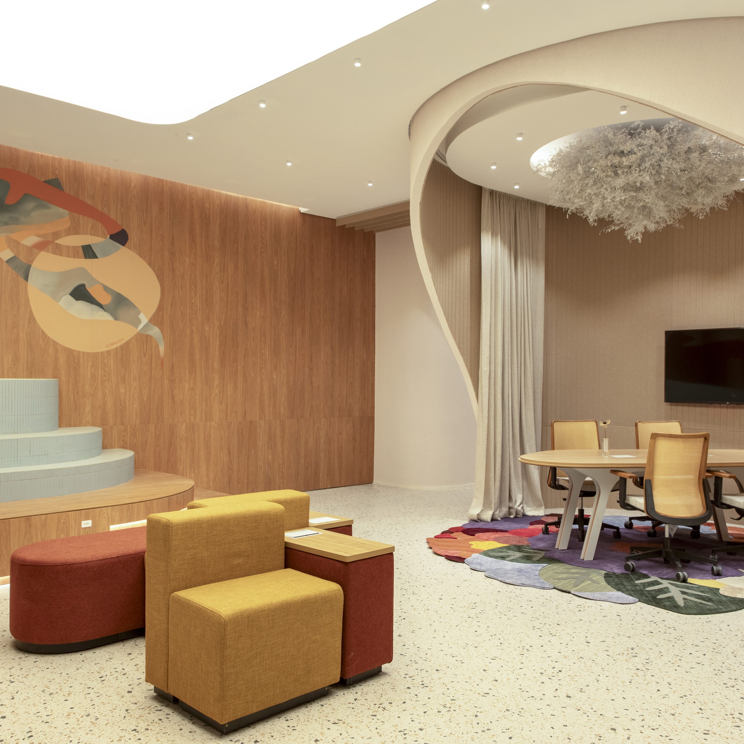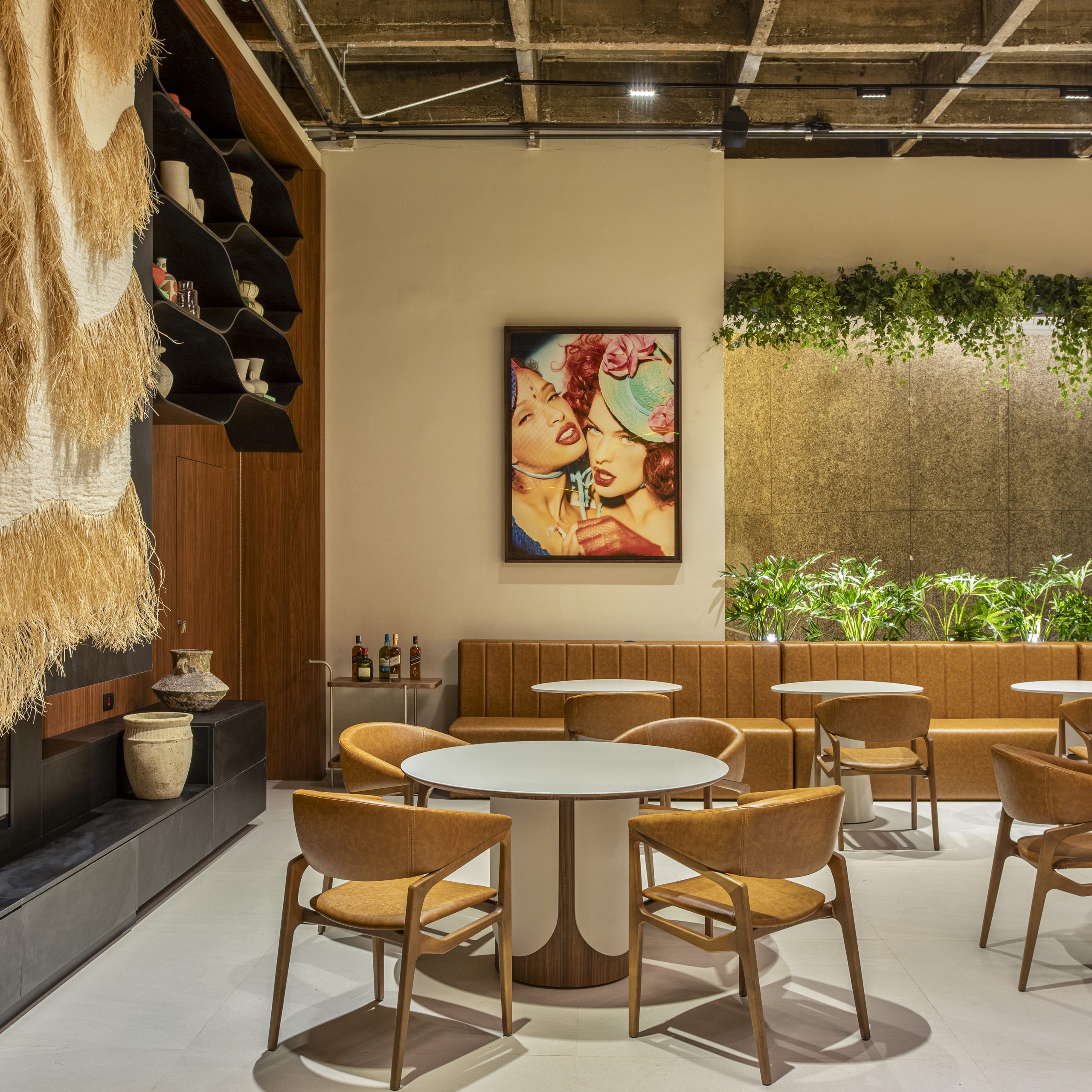 Cinco arquitetas respondem por este coworking de 143 m²: Isabella Leonetti, Mariana Paquier, Alessandra Ruiz, Pierina Piemonte e Carolina Correia. Por isso, o poder do feminino como elemento da linguagem do ambiente foi um caminho natural. Assim como o útero abriga e nutre a vida, o espaço é um santuário do afeto, um ventre acolhedor que celebra a energia da mulher e a força da criação, para orquestrar esse senso de pertencimento, o escritório empregou formas curvas e orgânicas, cores quentes e neutras e um mural com arte urbana. O mobiliário é da Minimal Design e o espaço totalmente funcional, pode ser utilizado para trabalho e reuniões, mediante agendamento. Todas as quartas-feiras, às 17h, talks e palestras sobre arquitetura e bem-estar agitam a programação.