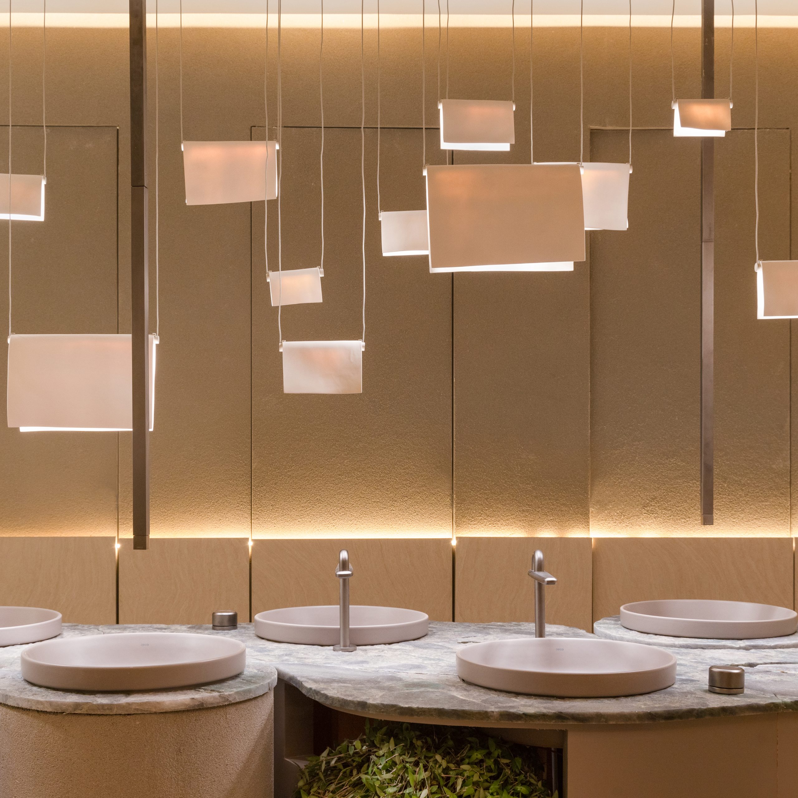 Circulação fluida e iluminação bem pensada são dois chamarizes do banheiro funcional de 48 m², das arquitetas Débora Pinheiro e Renata Nascimento. A cabine central disposta como ilha, realçada por meio de fontes de luz direcionadas do alto, carrega o conceito de introspecção e guarda uma inteligência projetual ao abrigar discretamente o ponto do hidrante. Além disso, a biofilia também marca presença por meio do uso das chapas de pedra que dão forma à bancada e das plantas que a povoam.