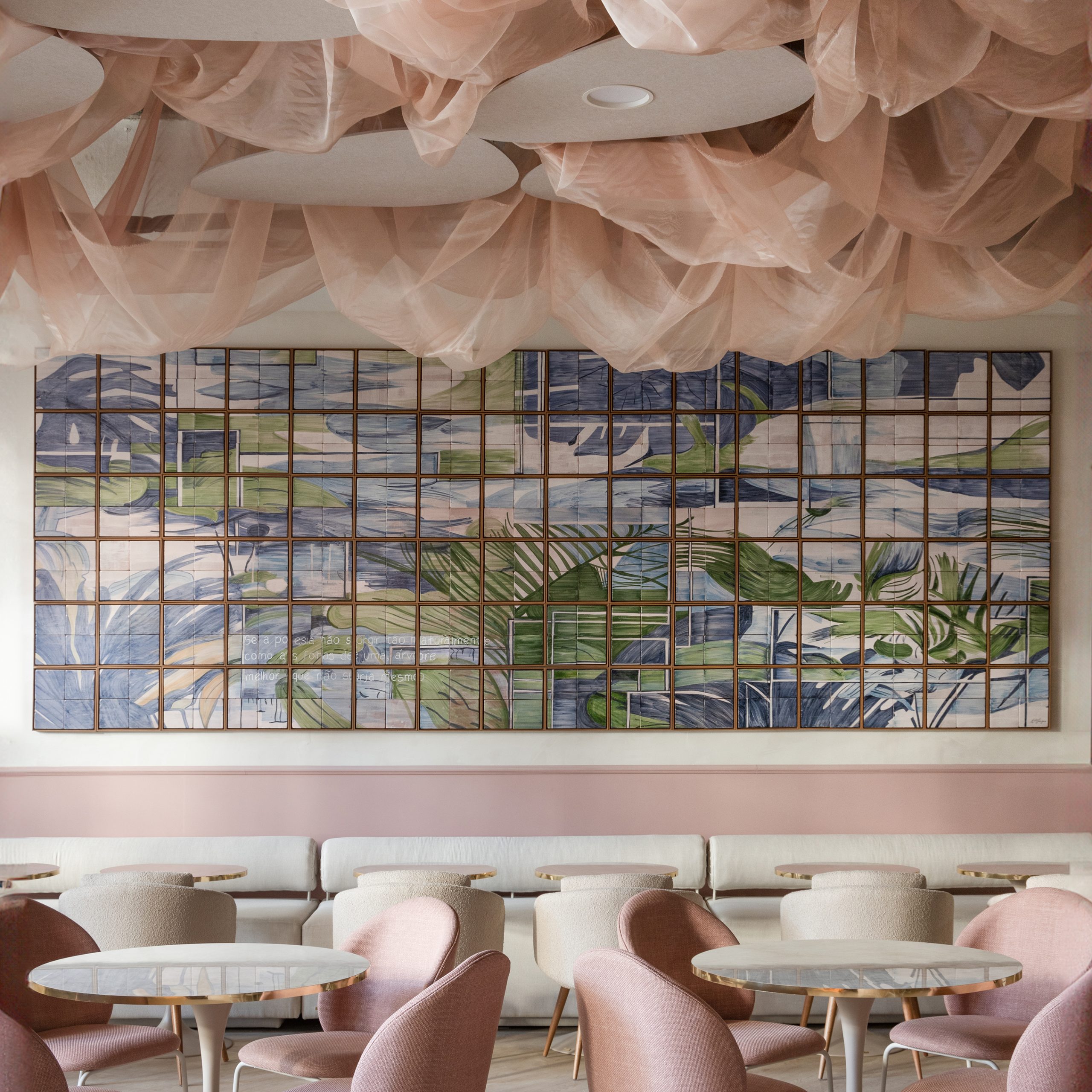 Que ancestrais queremos ser? Com esse questionamento em mente, as arquitetas do Studio HA elaboraram uma proposta que valoriza o belo e oferece um sentimento de esperança por meio de tons de rosa acolhedores, formatos fluidos, forro de tecido e cenários que estimulam a proximidade com o outro. Comandado pela chef Isabela Akkari, o café de 215 m² possui cinco setores: cozinha, sala privada, salão com mesas, área de serviços e atendimento. Para conhecer o café, é necessária a realização de reserva.