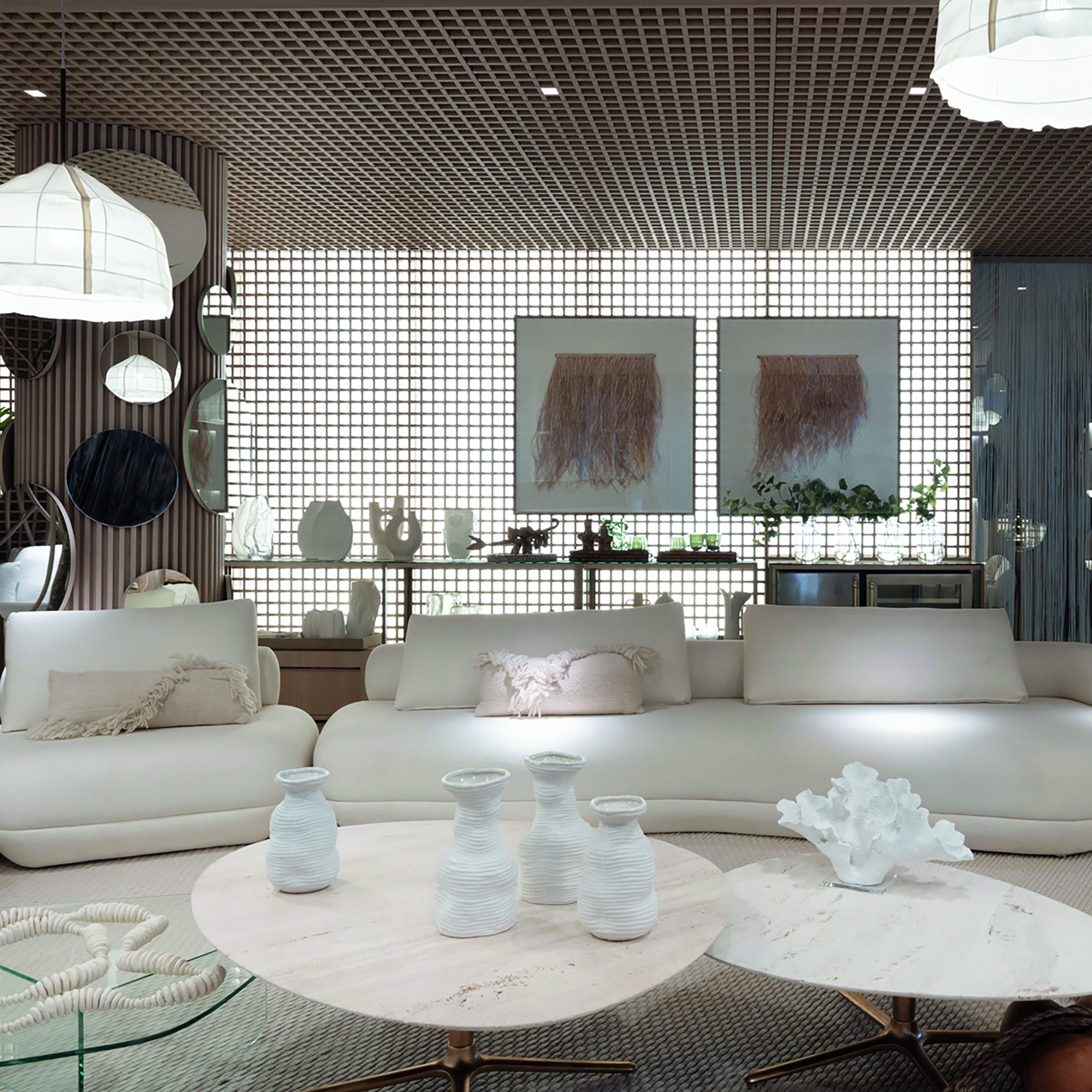 Nesta edição, o Bar Caracol, ambiente de 152 m² projetado por Gabriela Prado, busca resgatar a ancestralidade. A intervenção no teto, que lembra um vitral, ganha modernidade quando a fita de led que transpassa sua estrutura se acende e ilumina o espaço. Ali, o Bar Caracol opera sobre um piso misto de cerâmica e porcelanato, com desenho orgânico em tons de cinza e de azul. Duas paredes ripadas curvas dão movimento ao espaço, marcado por móveis de linhas retas — com exceção do sofá oval da entrada, que leva a assinatura do designer egípcio Karim Rashid, um dos lançamentos exclusivos presentes CASACOR São Paulo 2024.