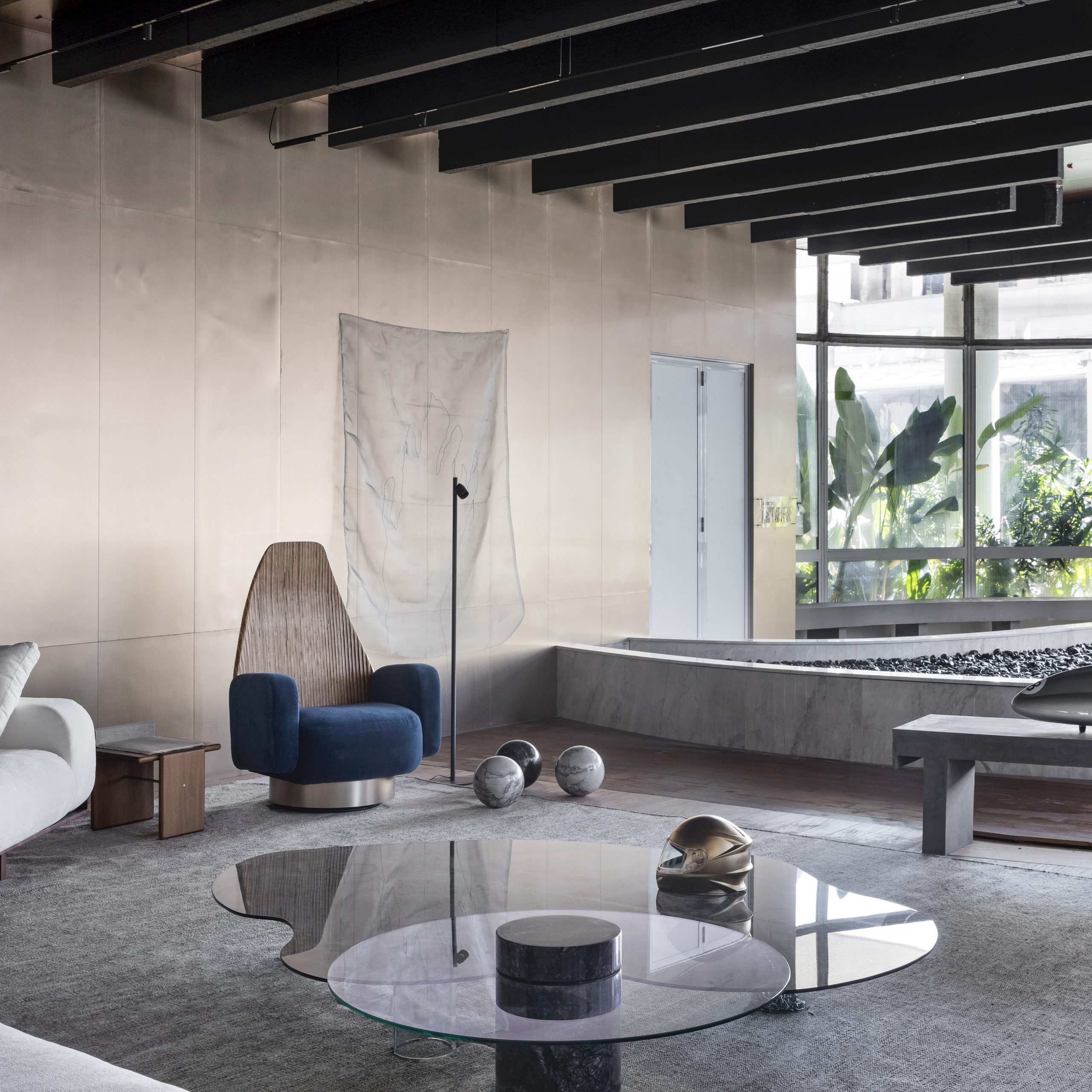 Nos 130 m² do lounge do Banco BRB, projetado por José Navarro, materiais refletivos meticulosamente posicionados induzem a pensar na fugacidade das coisas. Em um bom exemplo de reaproveitamento, a poltrona com estofamento azul, ganhou encosto encontrado entre os descartes da fábrica que produziu o sofá. Há, ainda, um recurso invisível de climatização: instalado em um piso elevado reutilizado, o espelho d’água funciona como um sistema passivo de refrigeração do ar.