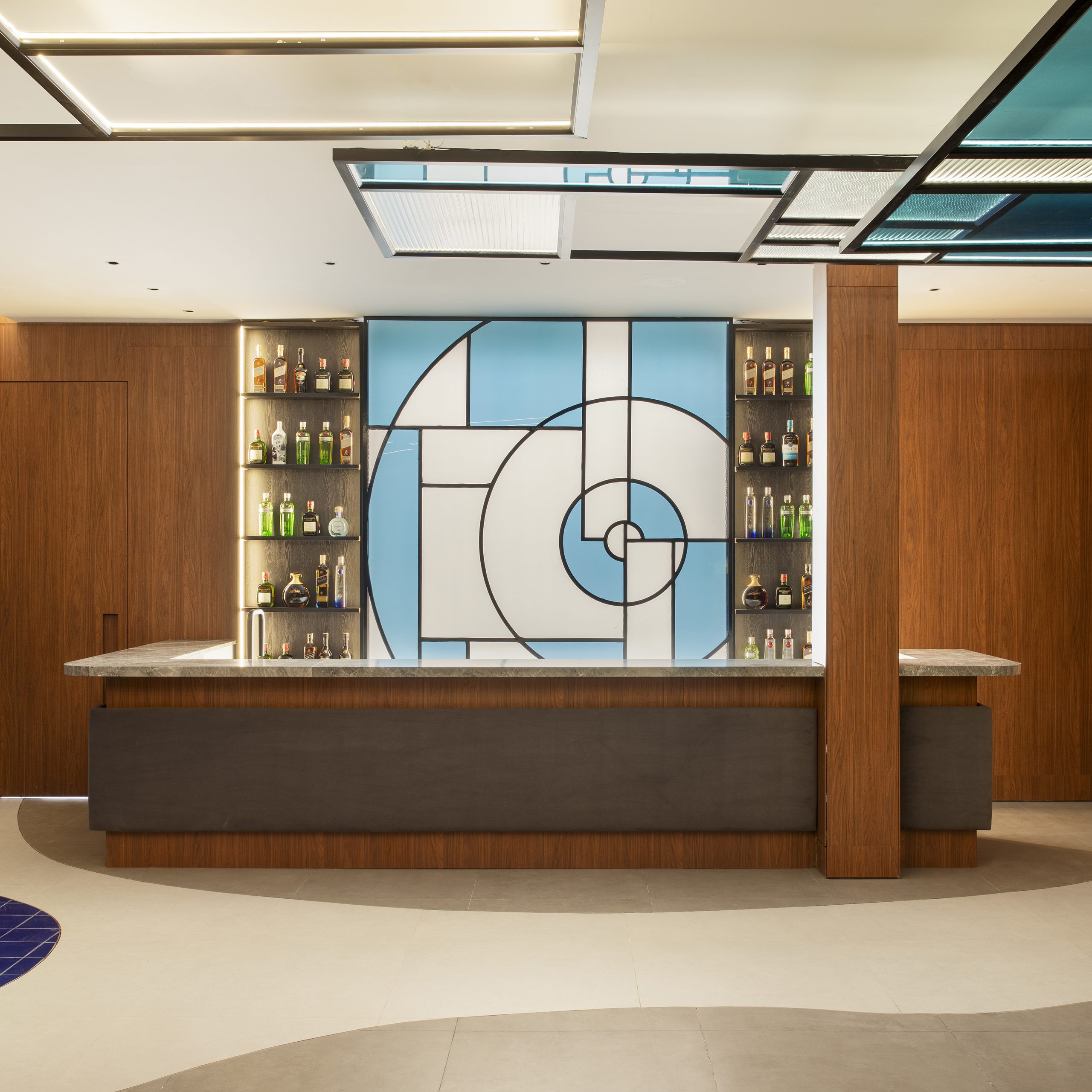 Com 85 m², o lounge projetado pela arquiteta Carla Felippi, oferece uma experiência sensorial, que se alterna entre a calma e a excitação. A iluminação desempenha um papel de peso e um grande painel de tela tensionada replica o efeito da luz natural, enquanto outros muitos cenários luminosos — incluindo um trecho estroboscópico — completam o efeito criado no ambiente. Os espelhos dispostos nos pilares, que foram revestidos de um MDF ripado capaz de acompanhar sua curvatura, servem, na visão da arquiteta, como um convite para olhar para trás.