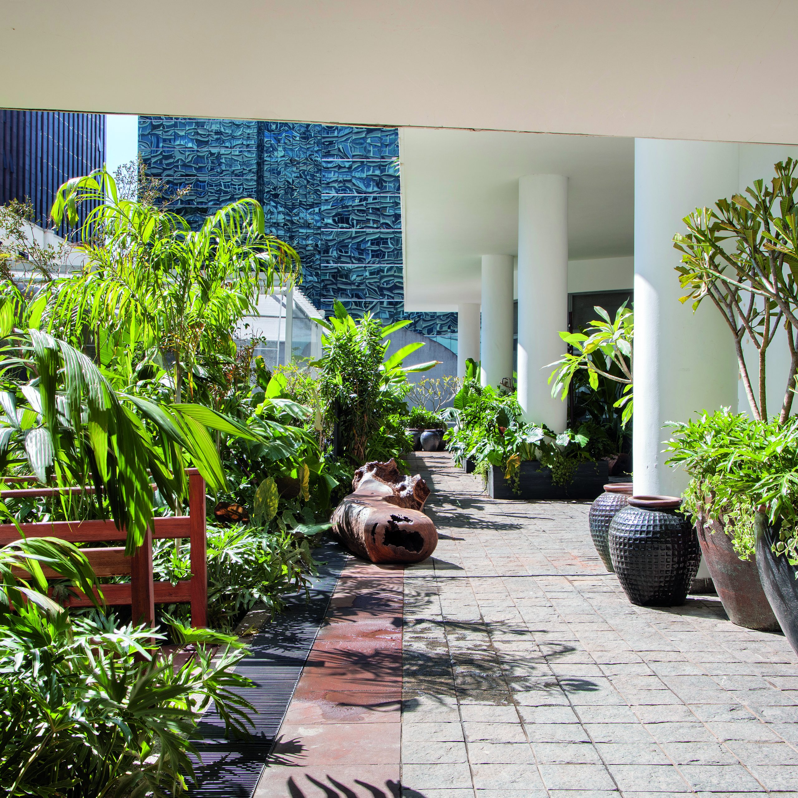 Ao homenagear o Rio Xingu, que nasce no Centro-Oeste e corta a Amazônia, a paisagista Mônica Costa busca promover o diálogo sobre o uso consciente dos recursos naturais em seu jardim de 265 m², que induz à desconexão do entorno urbano. Veio daí a vontade de ocupá-lo com plantas e madeira carbonizada, empregada nas divisórias e nas jardineiras. Em alusão ao comércio legal, a disposição das ripas na lateral insinua um código de barras. O deck de cumaru e o banco esculpido de um tronco caído exemplificam maneiras sustentáveis de usar a matéria
