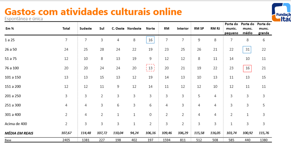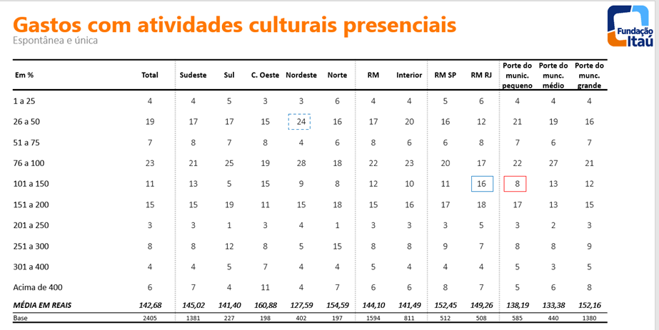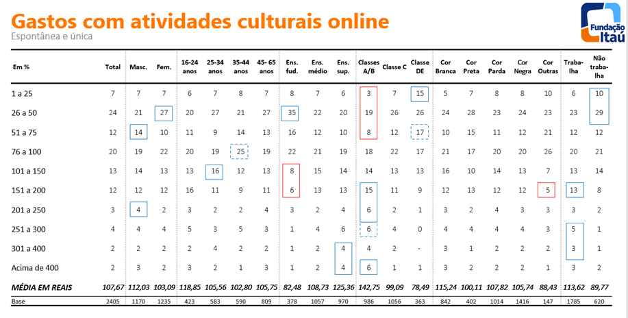 A pesquisa Datafolha Fundação Itaú também investigou o perfil de gastos dos brasileiros com atividades culturais. De acordo com o levantamento, 20% dos entrevistados dizem só fazer atividades gratuitas (o índice sobre para 36% nas classes D/E). Já 39% dos entrevistados dizem fazer mais atividades gratuitas que pagas, 33% declaram fazer mais atividades pagas que gratuitas (48% nas classes A/B e 19% nas classes D/E) e somente 8% declaram fazer somente atividades culturais pagas.