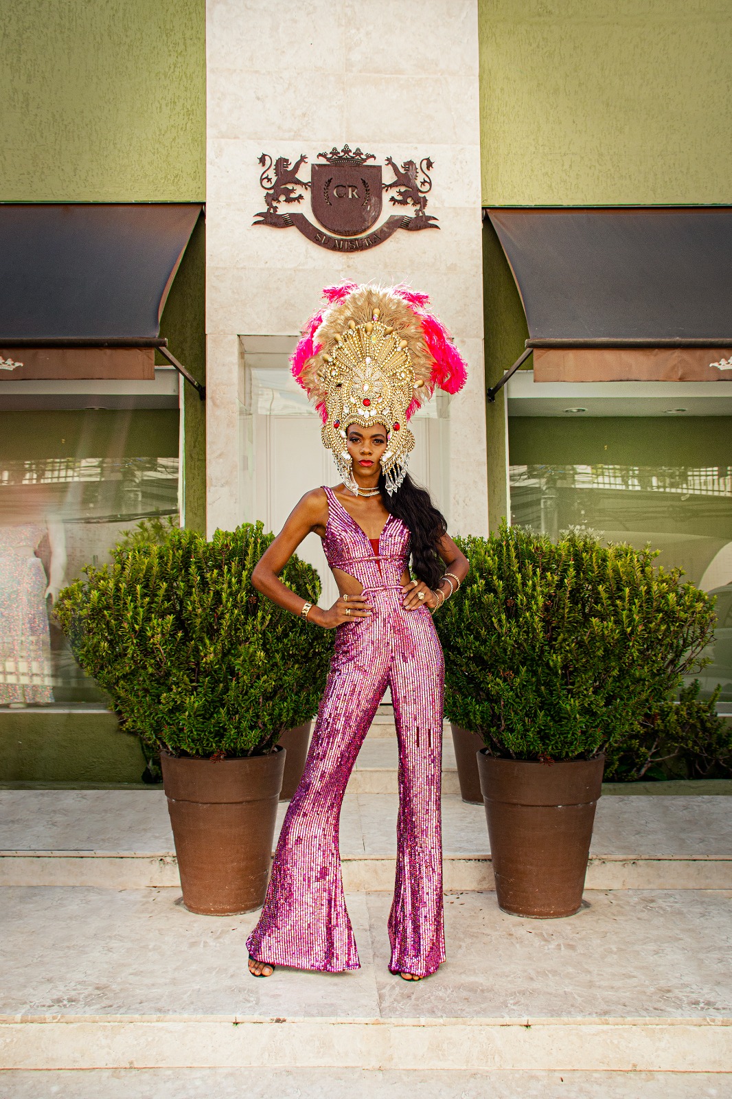 A cantora baiana Gal Costa foi a grande inspiração de Sande para a criação dos adereços, que trazem muitos elementos tropicais. “Ouço Gal Costa todos os dias, todas as horas, todos os momentos, amo, faz parte da minha vida, então resolvi homenageá-la dentro dessa coisa do nosso colorido, da nossa Tropicália, movimento que ela integrou”, explica o criativo, que ao longo dos anos já homenageou Clara Nunes, Joãozinho Trinta, Evandro de Castro Lima, entre outros nomes.