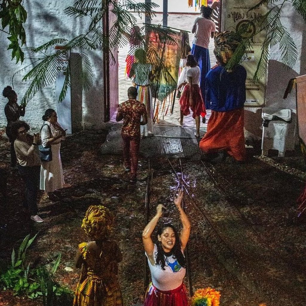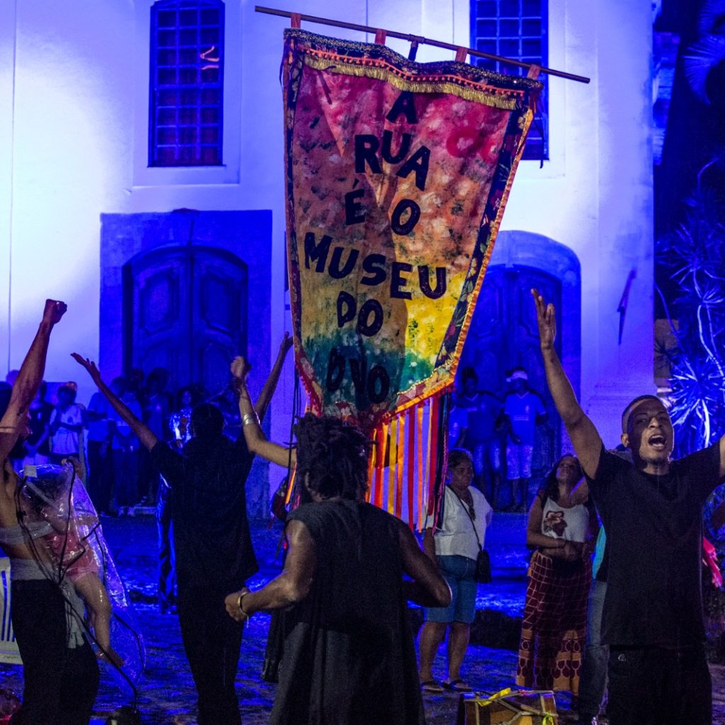 Para a atividade de encerramento da Residência Artística “O Museu é a Rua” o Grupo de Arte Popular A Pombagem está preparando uma performance de rua em que a montagem da exposição será desfeita e os objetos e adereços do coletivo, outrora expostos e dispostos na Galeria 3 do museu, serão então desinstalados e levados, em forma de cortejo cênico, para fora do museu. É precisamente o movimento de retorno do coletivo à sua sede real, isto é, a que fica no bairro de Fazenda Grande do Retiro. Lembrando que o Programa Residência Artística do MAM tem essa perspectiva de acolher iniciativas culturais da periferia para ocuparem, por 3 meses aproximadamente, a Galeria 3 do museu. O encerramento da Residência Artística “O Museu é a Rua” contará com “A Volta d’A Pombagem” – uma performance em que o coletivo vai fazer o seu movimento de voltar para a sua sede, para a sua casa.