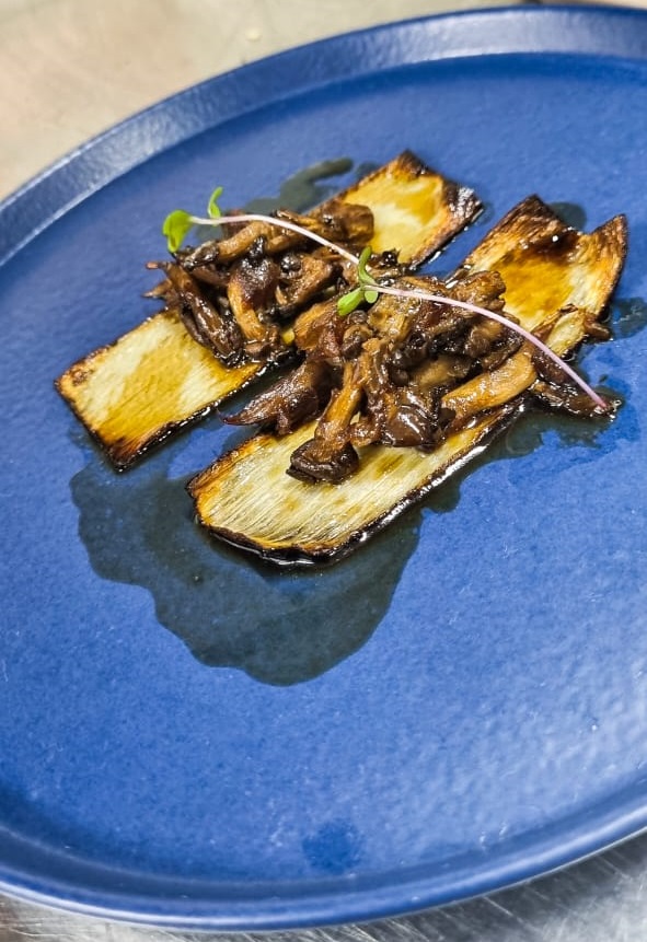 Entradas: Opção 1: Tagliata de carne do sol + aioli + picles de cebola roxa e maxixe + melaço de pimenta. Opção 2: Disco de Siri Empanado + vatapá de banana da terra + citronete Opção 3: Palmito Grelhado + shimeji + redução de balsâmico