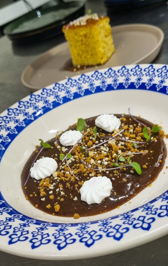 Sobremesas: Opção 1: Bolo de Fubá + doce de leita de cachaça Opção 2: Brigadeiro de Colher + suspiro + tapioca crocante + paçoca